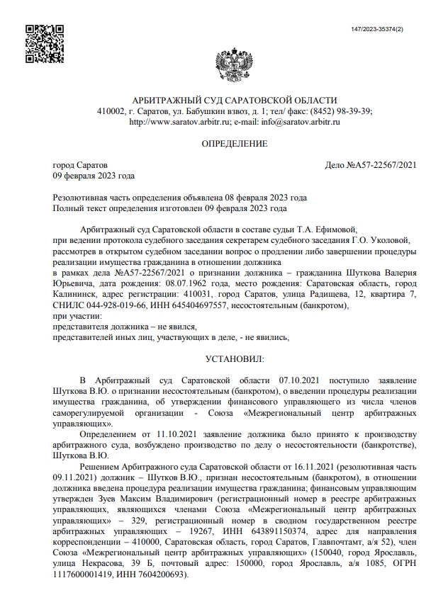 Завершить процедуру реализации имущества гражданина Шуткова Валерия Юрьевича, дата рождения: 08.07.1962 года, место рождения: Саратовская область, город Калининск. Освободить гражданина Шуткова Валерия Юрьевича от дальнейшего исполнения требований кредиторов, в том числе требований кредиторов, не заявленных при введении реализации имущества гражданина.